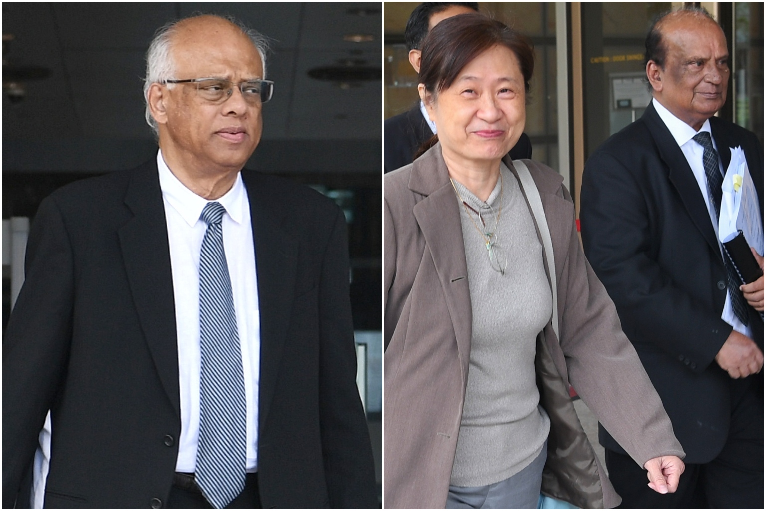 Senior Counsel Chelva Rajah (left) , who leads the legal team defending five town councillors, including three Workers' Party MPs, and FM Solutions and Services co-founder How Weng Fan (right) with her lawyer Leslie Netto at the High Court yesterday.