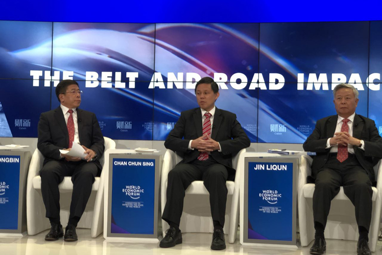 Minister in the Prime Minister's Office Chan Chun Sing (centre) speaking during a session on the One Belt One Road initiative at the World Economic Forum in Davos on Jan 24.