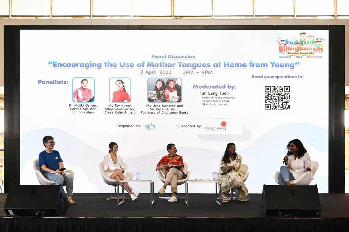 The other panellists were Ms Tay Kewei, a singer-songwriter who writes in English and Chinese, as well as Ms Usha Kumaran and Ms Razmiah Banu, who co-founded Chellamey Books to publish Tamil-language interactive books for children.