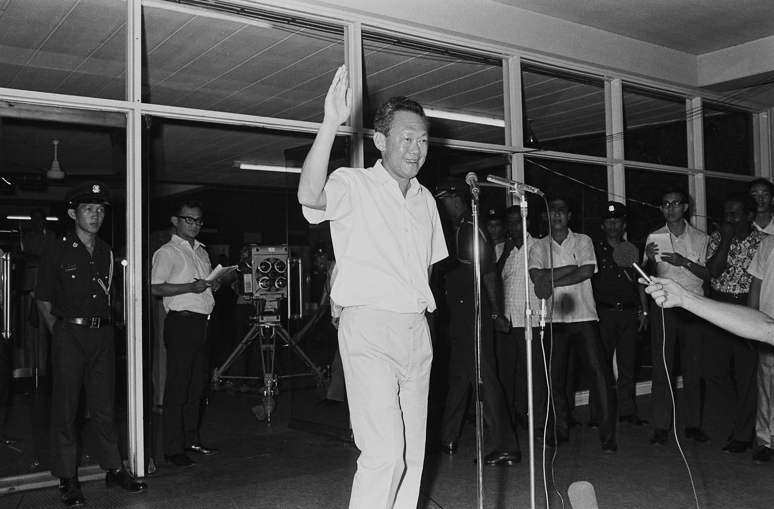 Prime Minister Lee Kuan Yew waving to the crowd from the Singapore Polytechnic counting centre after his victory in the general elections was announced in 1972.