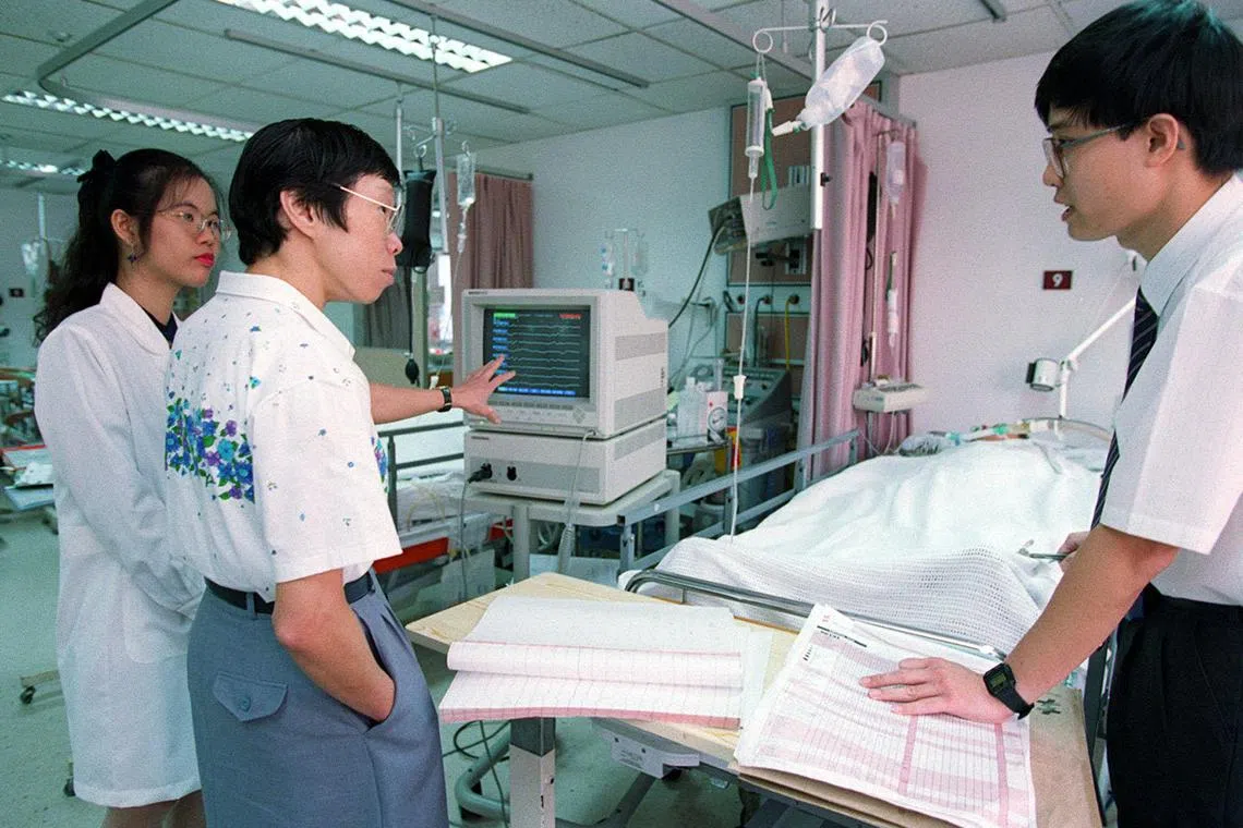 Dr Lee Wei Ling (centre) with doctors at Tan Tock Seng Hospital’s Neuro Intensive Care Centre on July 11, 1996.