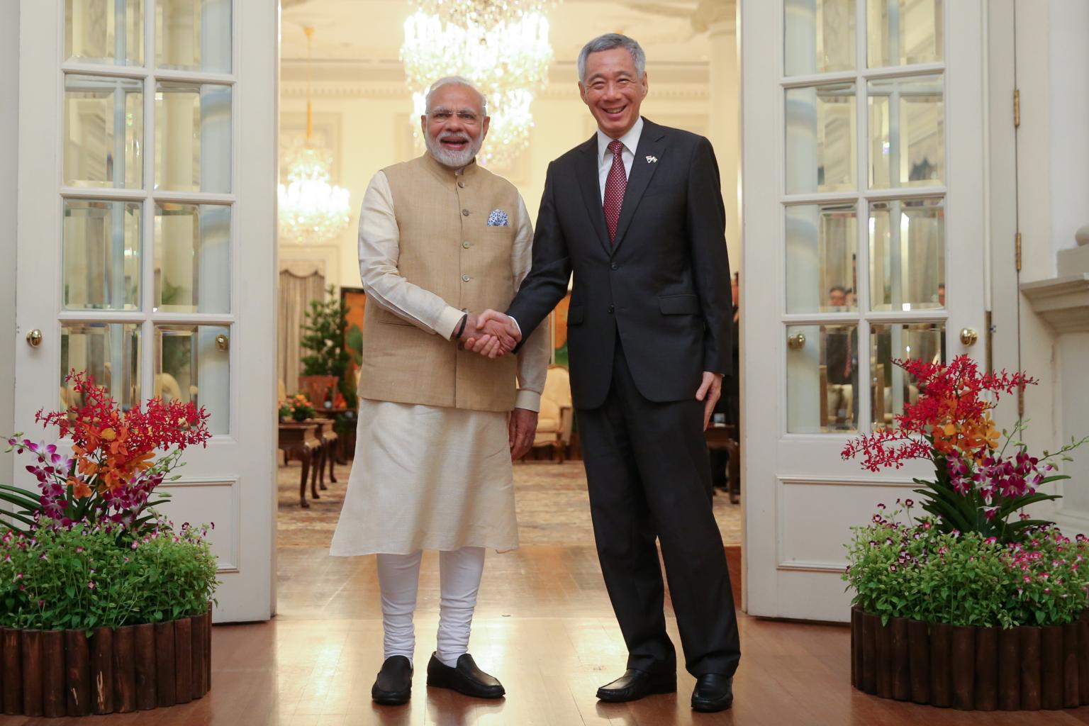 Singapore Prime Minister Lee Hsien Loong (right) shaking hands with Indian Prime Minister Narendra Modi at the Istana, on June 1, 2018.
