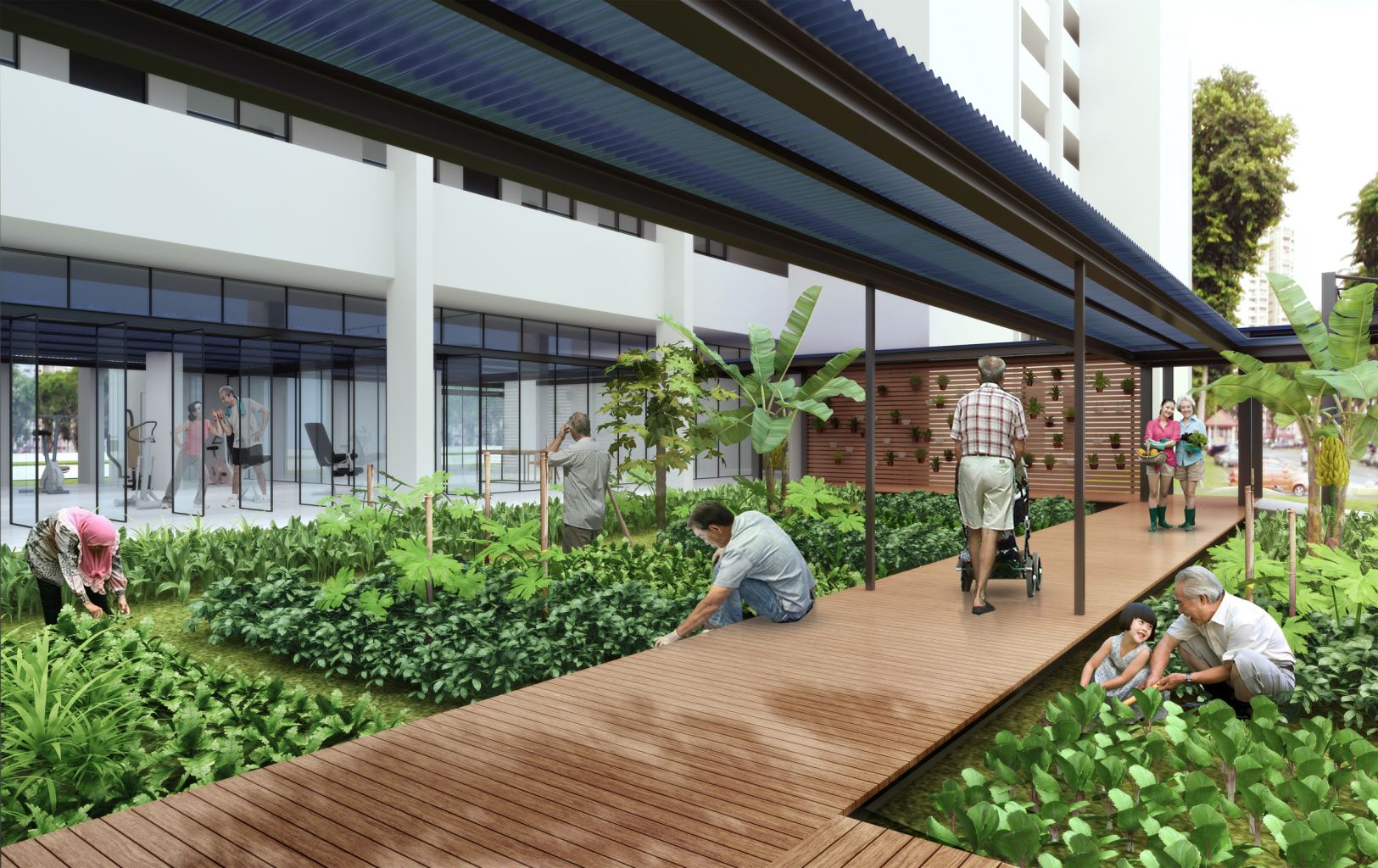The "community pocket" at Block 433, Ang Mo Kio Avenue 10, features a glass-partitioned void deck space which extends out to pavilions and sheltered boardwalks with garden plots on either side.