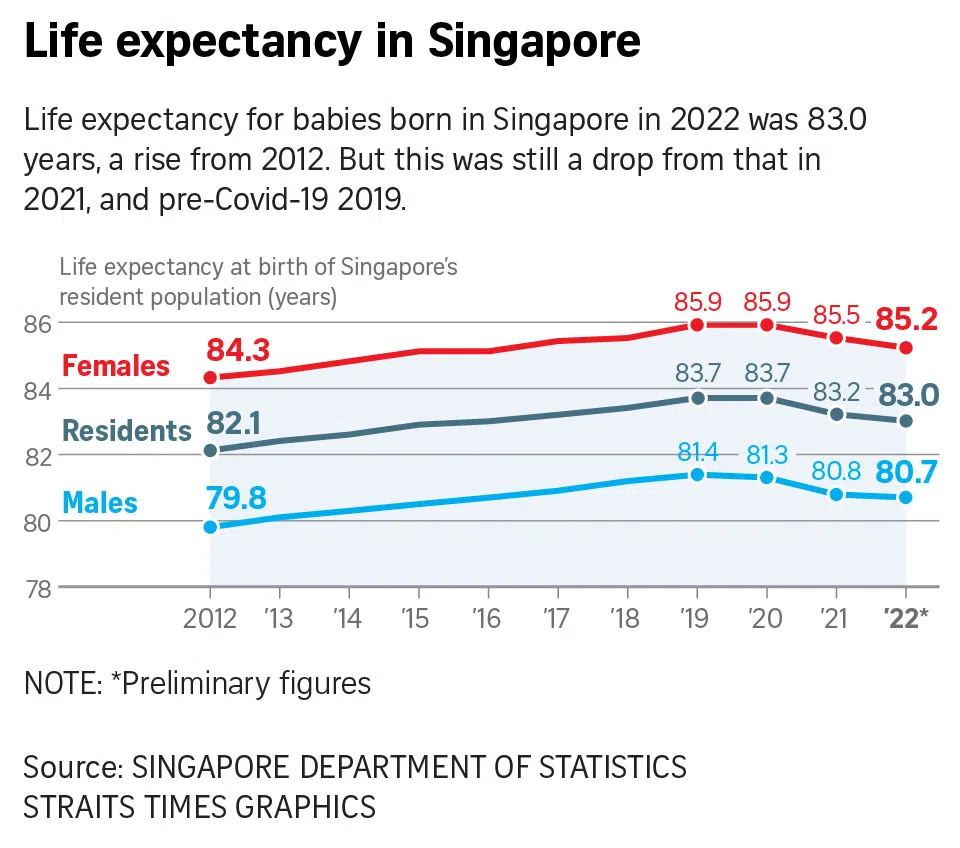 Life expectancy for babies born in Singapore in 2022 was 83 years, an improvement of 0.9 years from 82.1 years in 2012. This was still a decline of 0.2 years from 83.2 years in 2021, and 0.7 years from 83.7 years in pre-pandemic 2019.