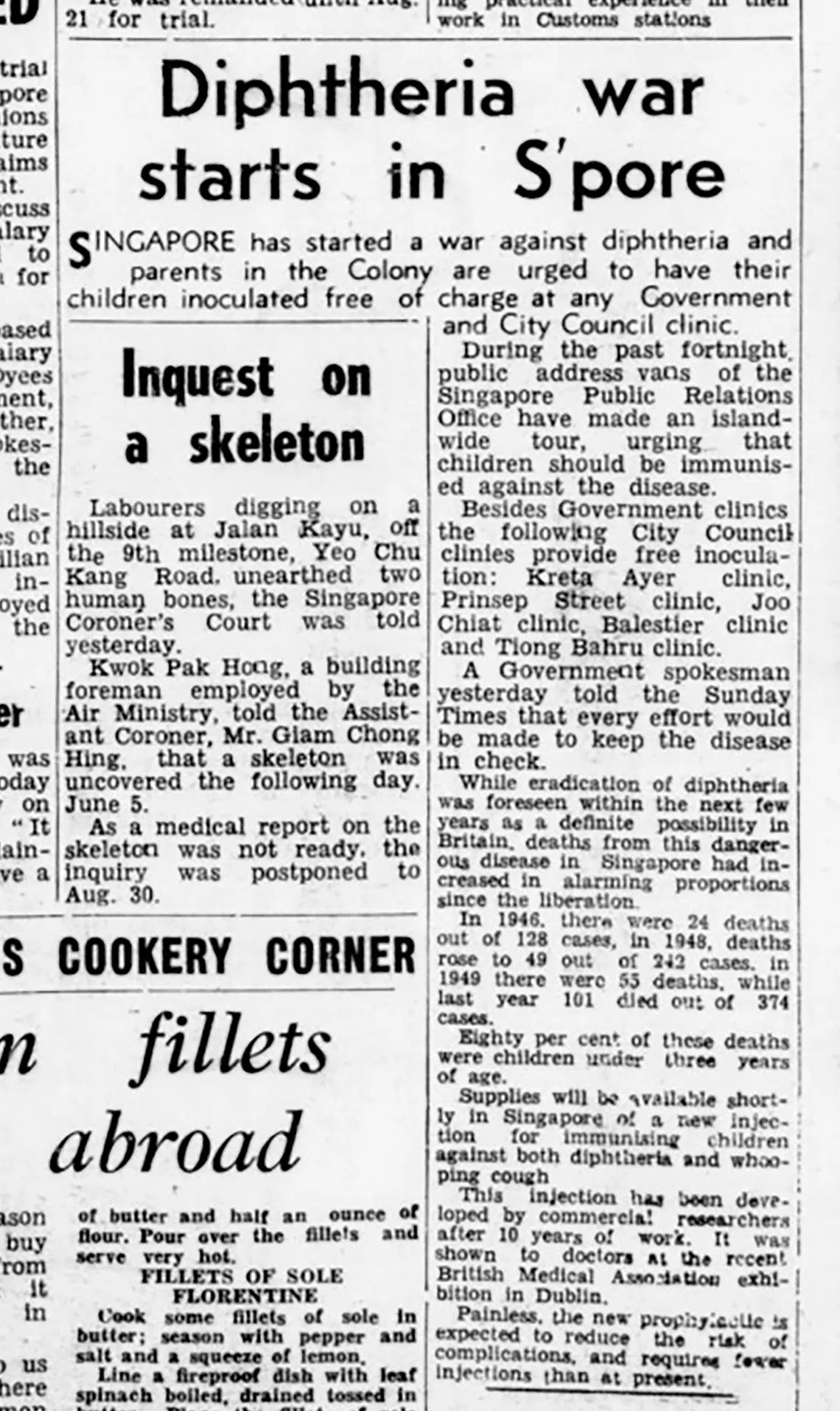 On July 20, 1952, the newspaper ran a story headlined “Diphtheria war starts in S’pore”, urging parents to take their children to government clinics for free inoculations.