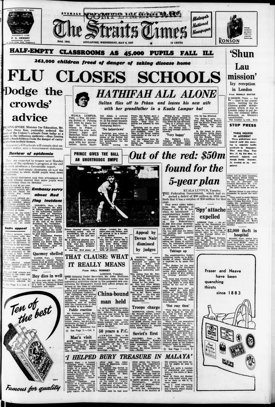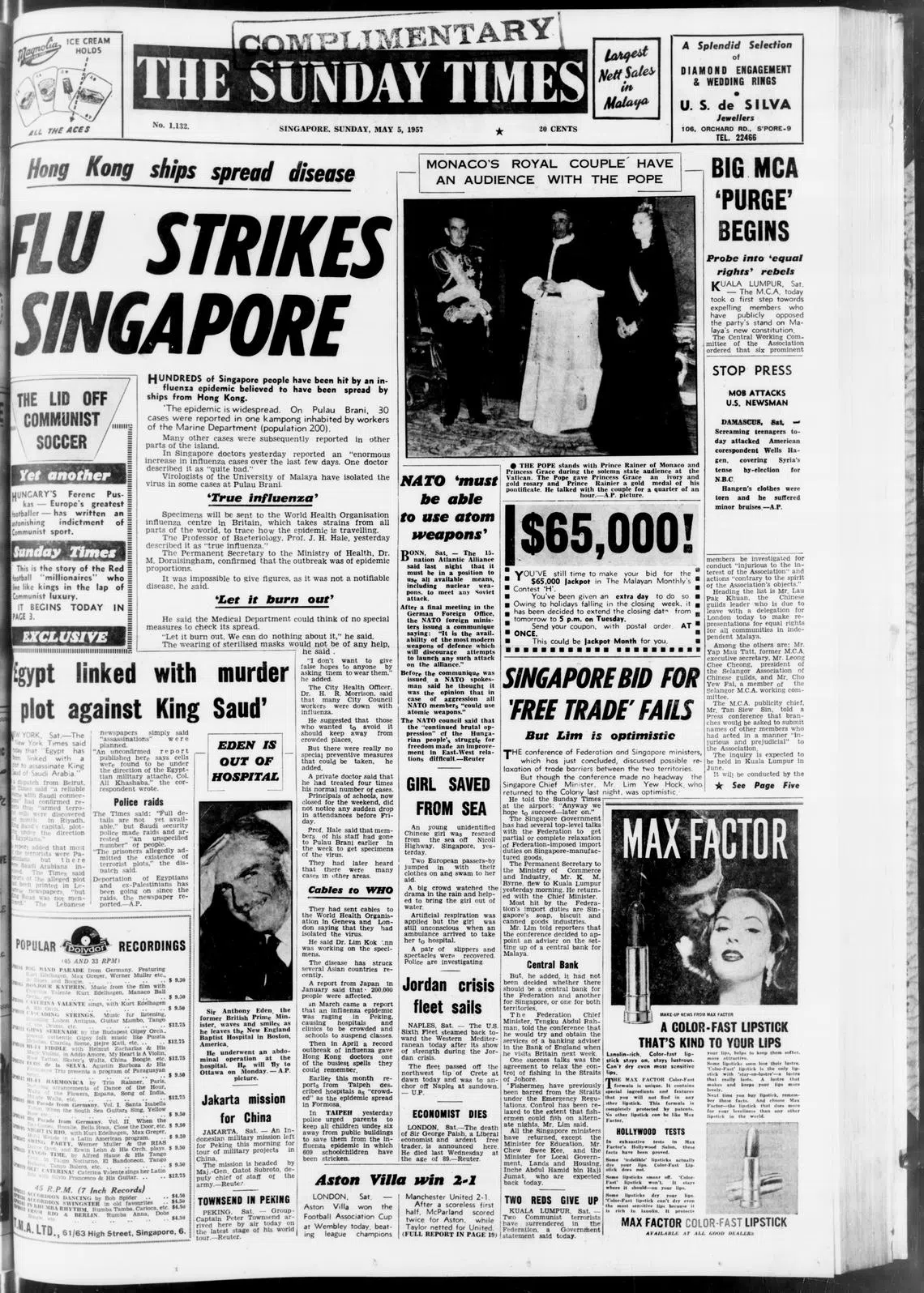 On May 5, 1957, with hundreds in Singapore falling ill amid the Asian flu pandemic, the paper ran a front-page article headlined “Flu strikes Singapore”.