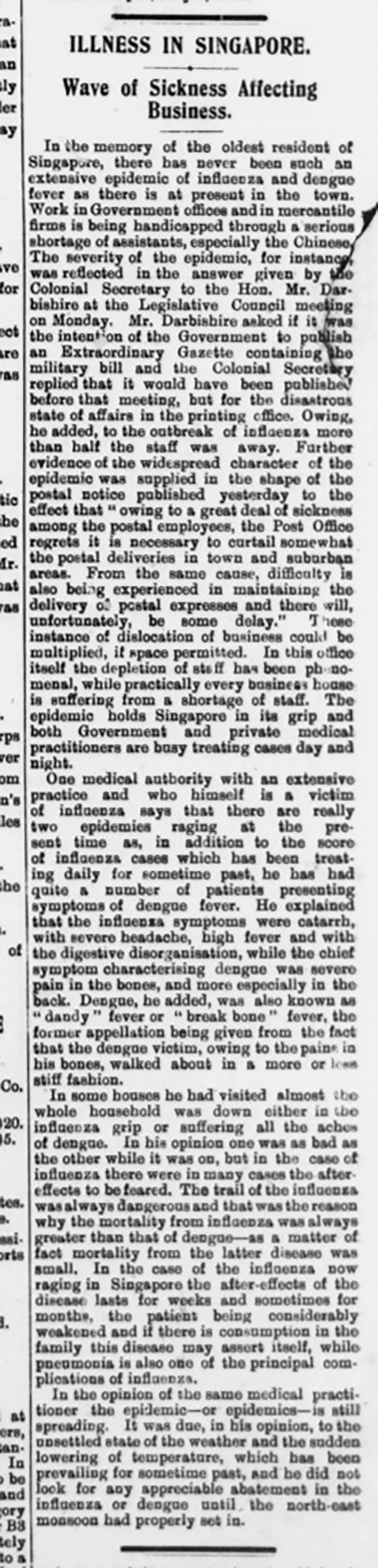 Headlined “Illness in Singapore, wave of sickness affecting business”, the article noted that postal services were disrupted as postal workers were falling sick.