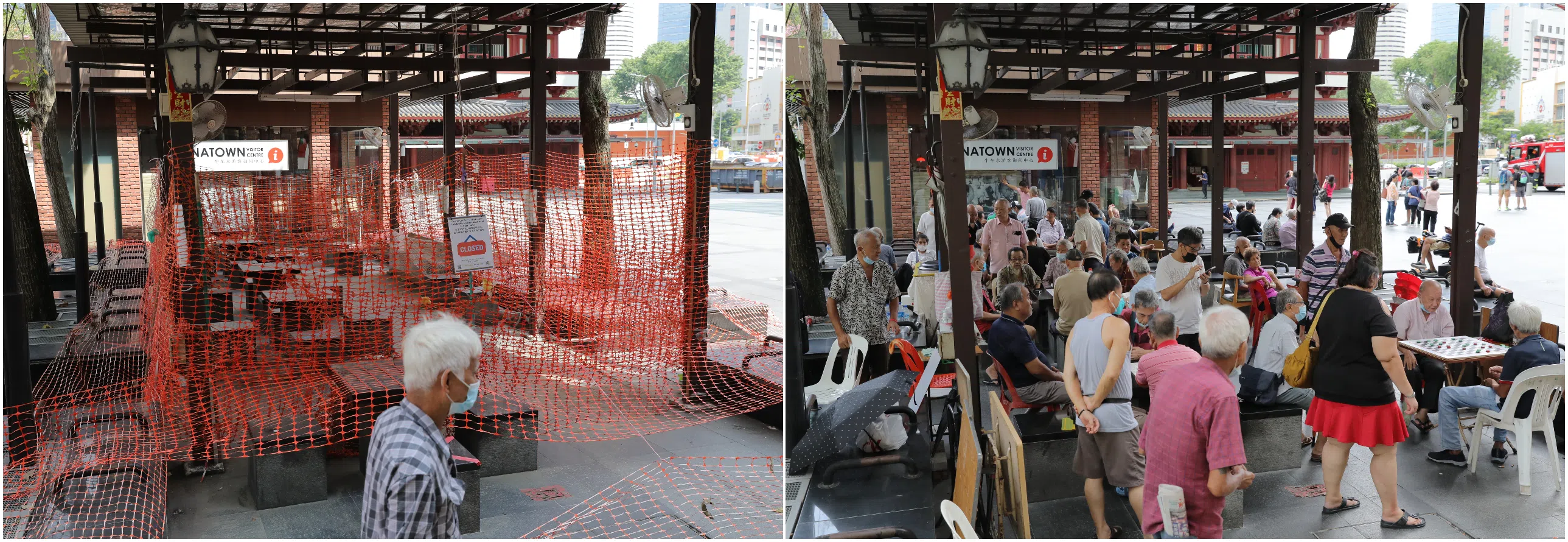 An open space at Chinatown Complex, closed on Sept 29, 2021 (left), as seniors were advised to stay home during the Covid-19 pandemic; and on June 23, 2022, after Covid-19 restrictions were lifted.