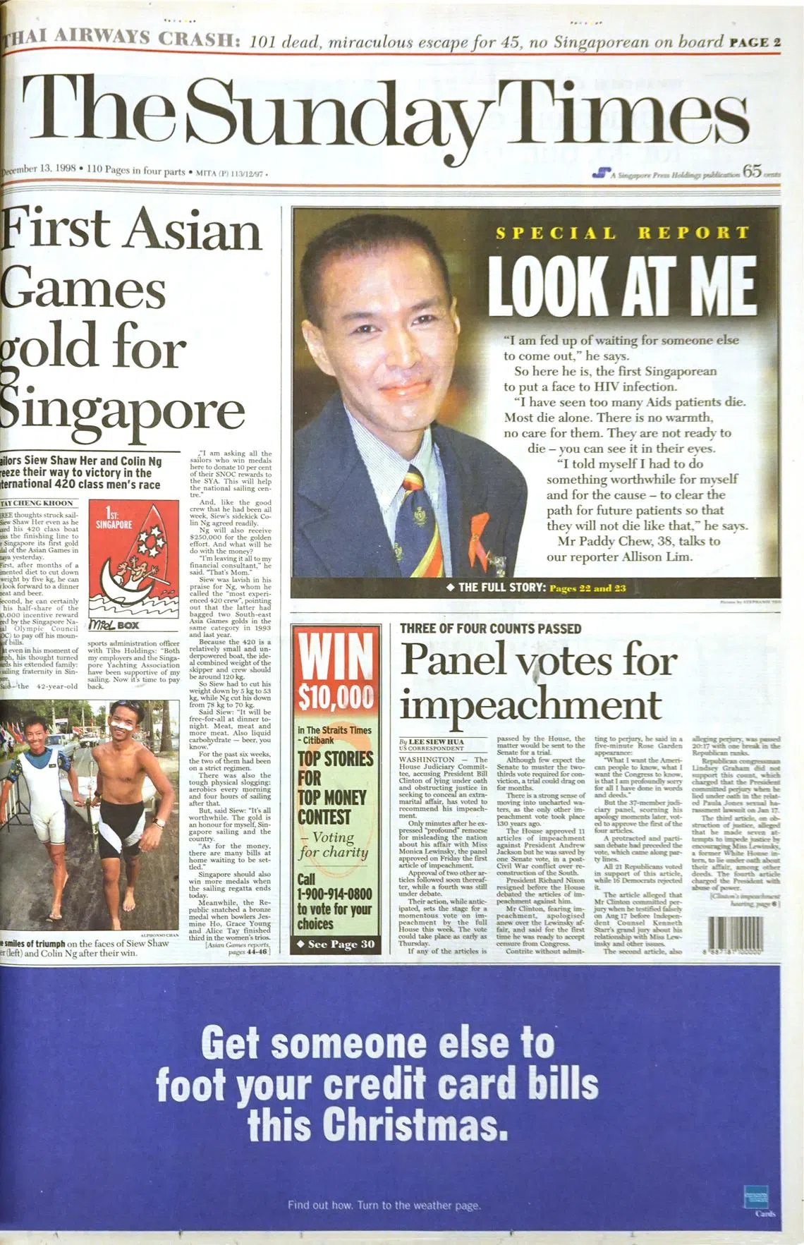 The next day, The Straits Times’ Sunday edition carried a photo of Mr Chew, then 38, on Page 1, with more stories on him and the disease across two pages inside.