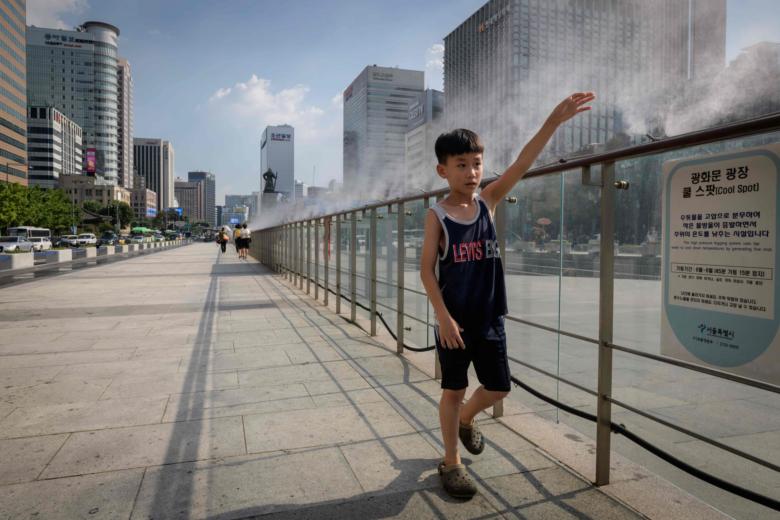 A child walks past a misting fountain in the central Gwanghwamun area of Seoul, on Aug 1, 2018. The world has already warmed about 1 deg C since pre-industrial times, fuelling stronger storms, more extreme floods, deadlier heatwaves and wildfires.