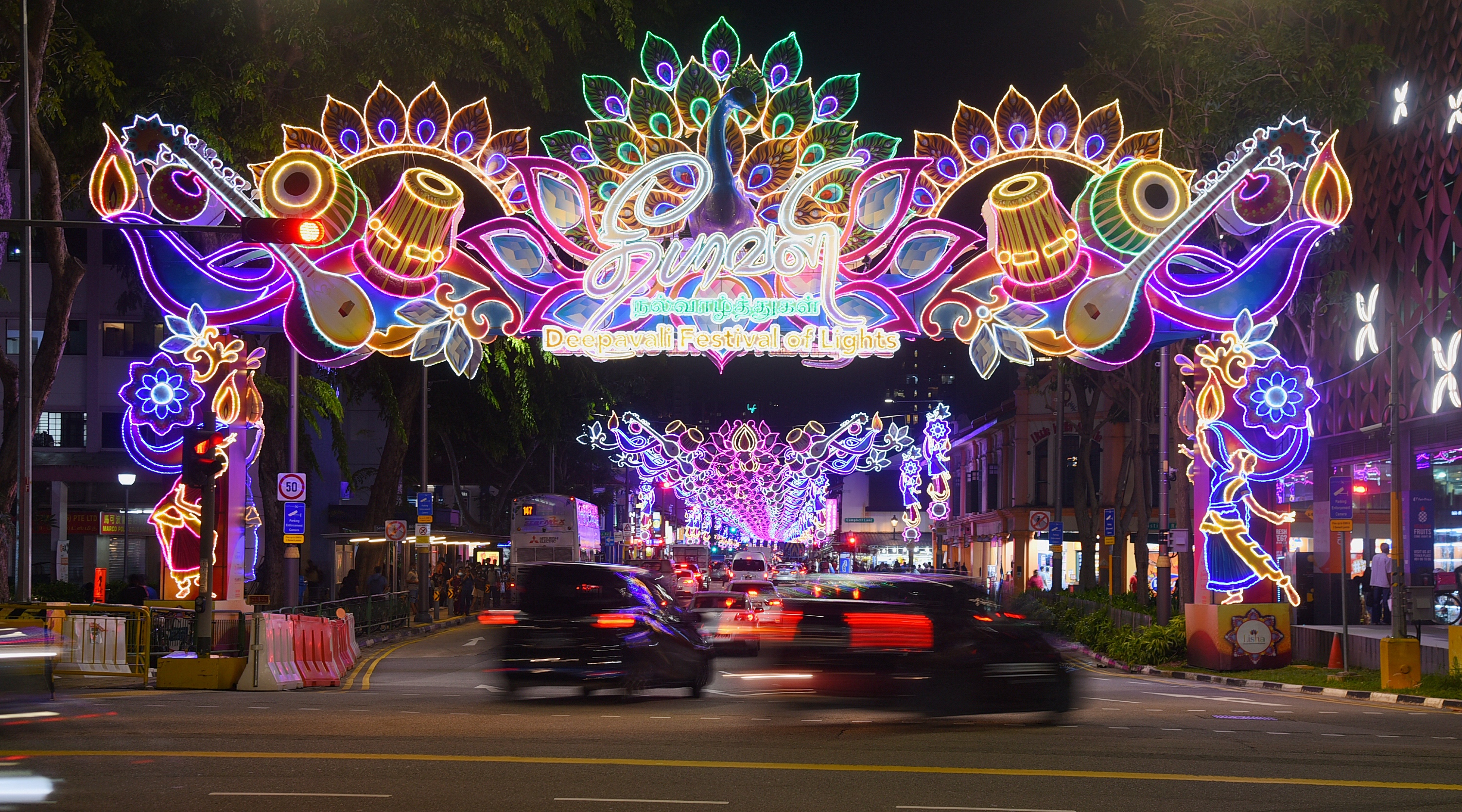 Showcasing Indian classical musical instruments, the multi-hued lights strung across Serangoon and Race Course roads will be turned on nightly till Nov 13.