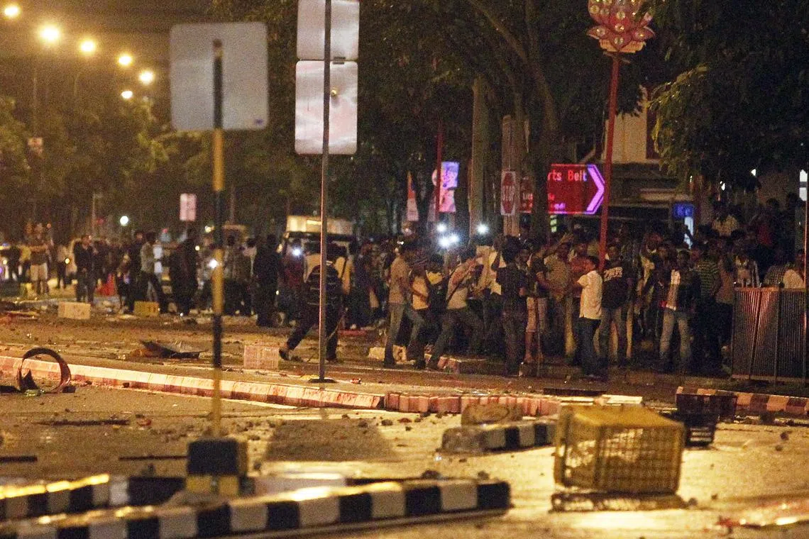 Police at the scene of the riot involving almost 400 people in Race Course Road on Dec 8, 2013. ASP Jonathan Tang (right) was injured after being attacked by rioters.