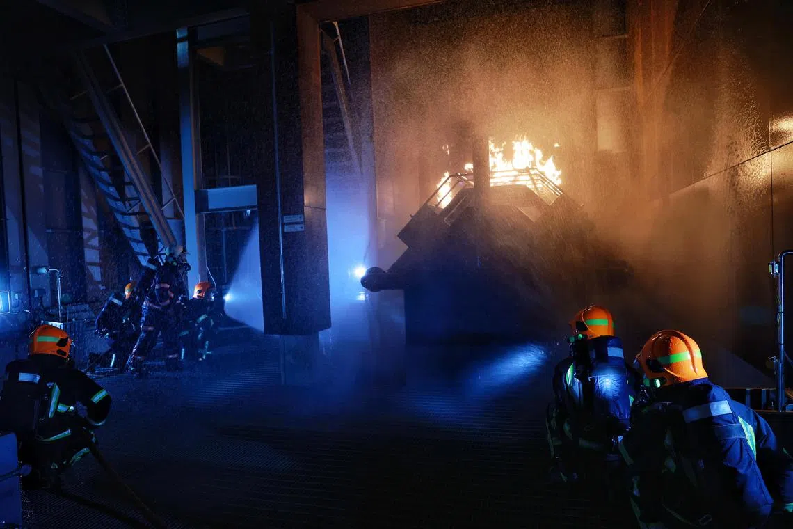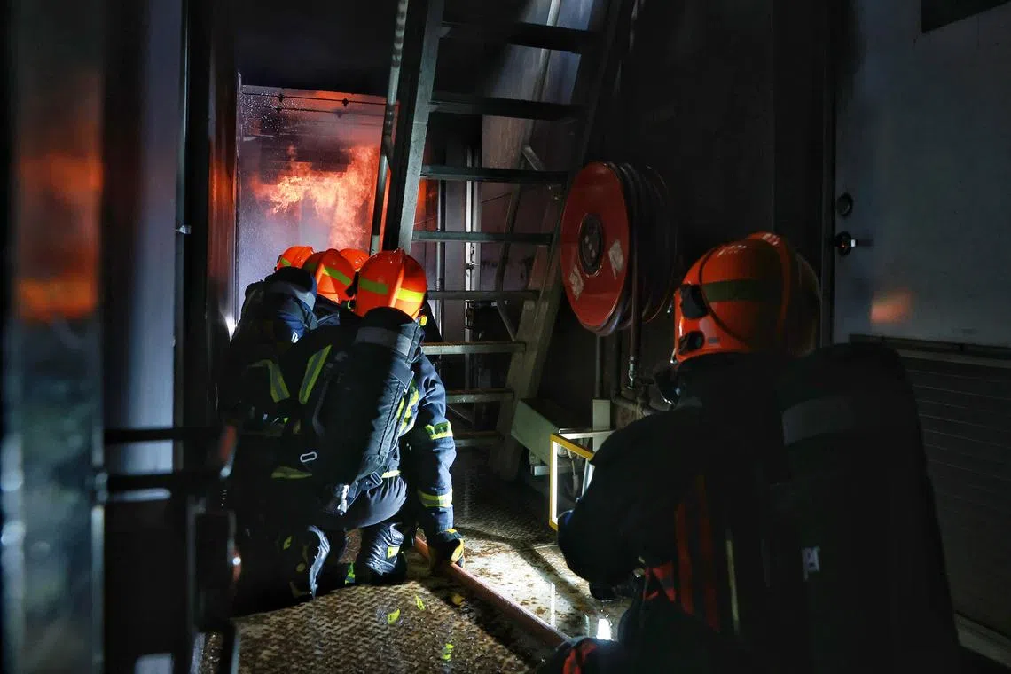 SCDF personnel work together in a section of four to put out an engine room fire as part of a drill that they undergo during their Firefighter Course.