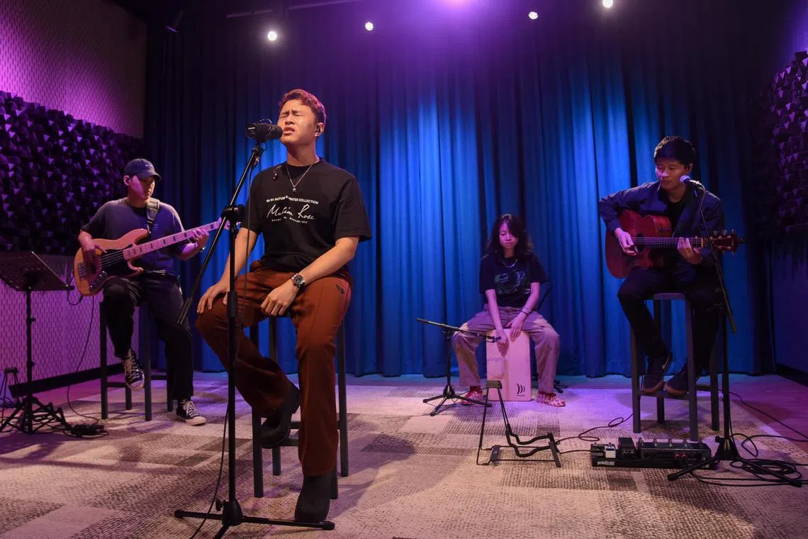 Home-grown singer-songwriter Rangga Jones (front) performing at Studio+65 for ST’s Music Lab podcast.