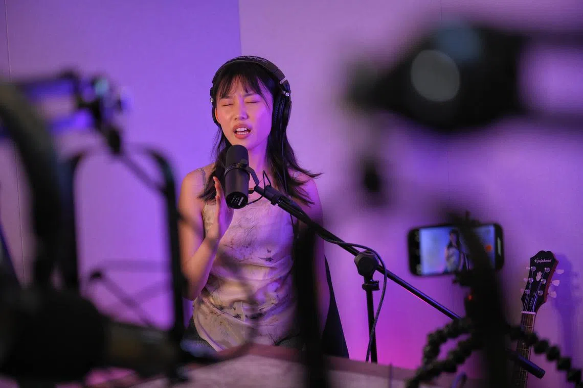 Emerging home-grown singer and songwriter rhyu singing in ST’s podcast studio.