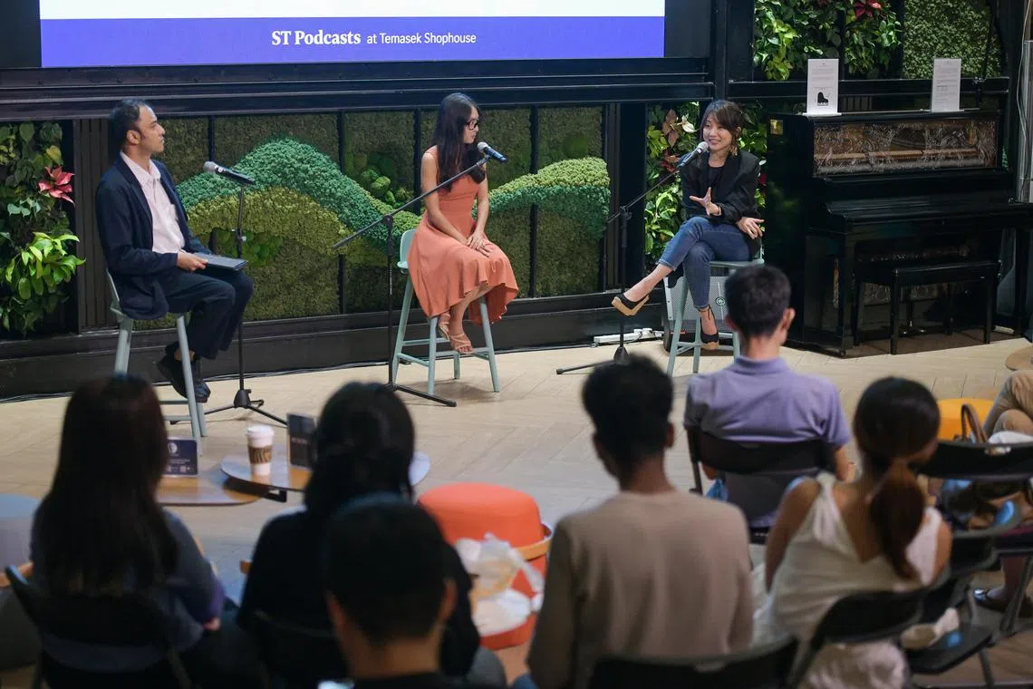 (From left) ST Podcast editor Ernest Luis, Just Keep Thinking co-founder Kong Man Jing and Ms Audrey Tan, Science Communications & Outreach lead at NUS’ Centre for Nature-based Climate Solutions at Temasek Shophouse on June 20.