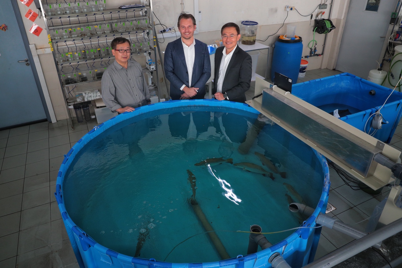 (From left) Dr Yue Genhua, senior principal investigator and programme director at Temasek Life Sciences Laboratory; Mr Andreas von Scholten, CEO of Barramundi Asia; and Mr Peter Chia, CEO of Allegro Aqua and Temasek Life Sciences Accelerator, pose next to a pool of Asian sea bass on Jan 17, 2020.