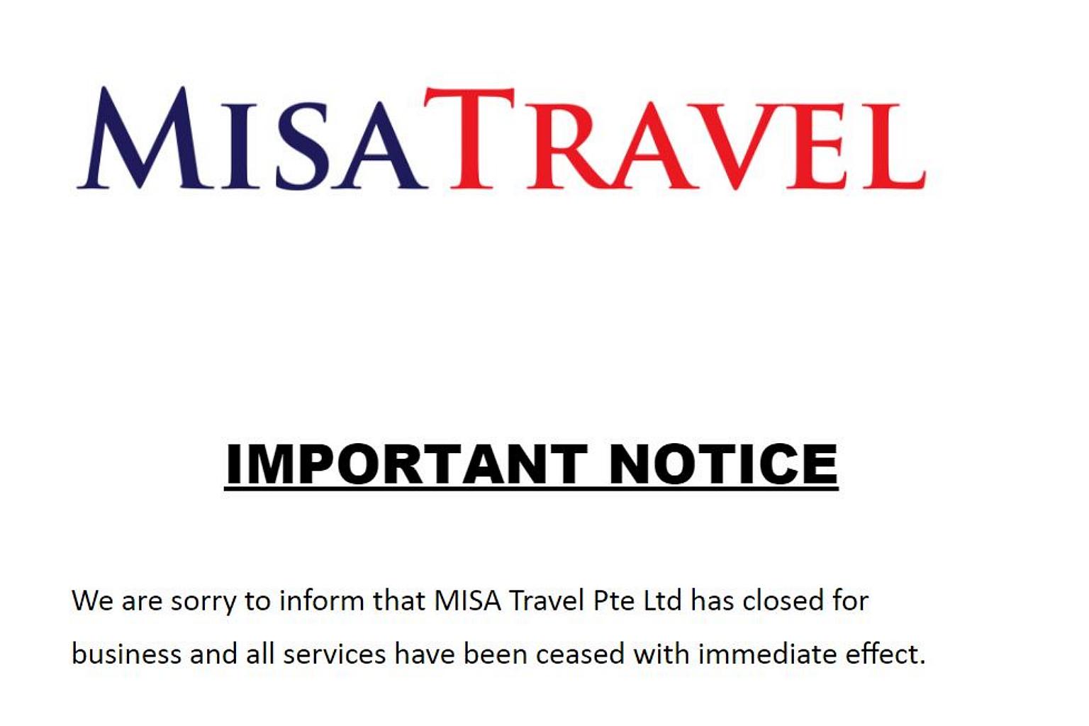 In a notice posted on the company's website, Misa Travel said it was closed for business and had ceased all services with immediate effect.