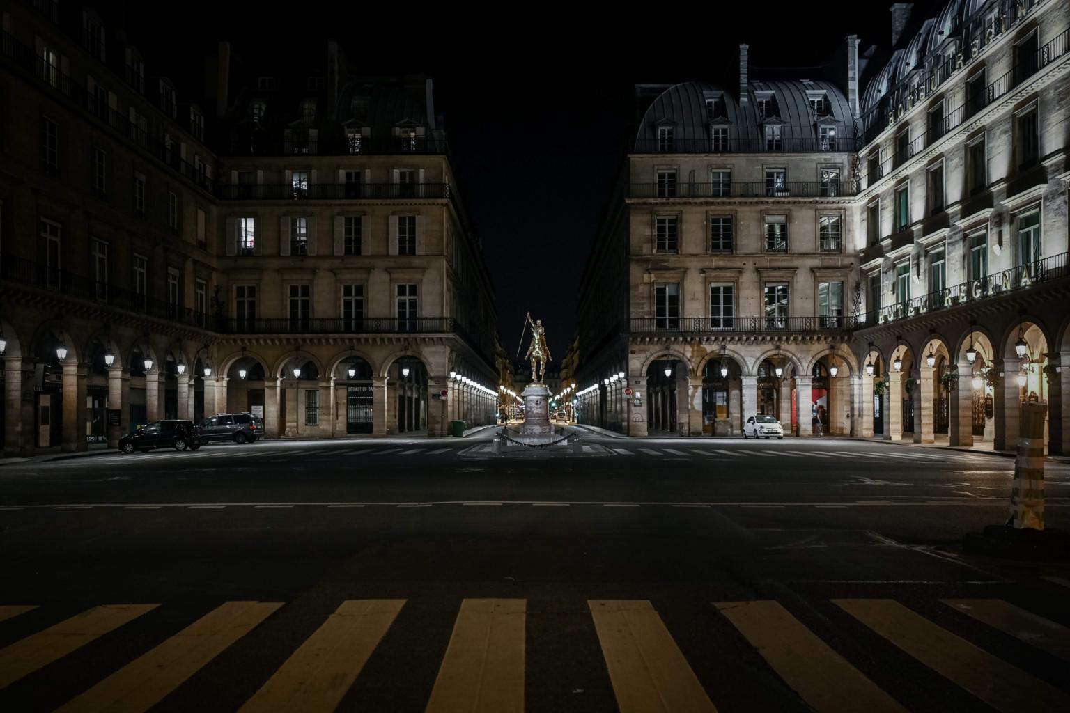 An empty intersection at night in Paris, after a lockdown was put in place, on March 18, 2020.