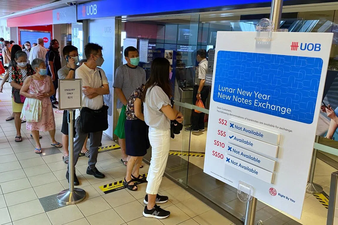 UOB managing director of group channels and digitalisation Benny Chan said booking slots for new notes and fit-for-gifting notes exchange at the bank’s branches were fully booked by about 8.30am and 12.40pm, respectively, on Thursday.
