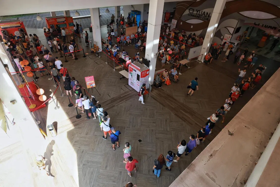SINGAPORE – A long queue, comprising mostly seniors who want to get their hands on new notes ahead of Chinese New Year, formed at two pop-up ATMs at Ci Yuan Community Club in Hougang on Thursday.