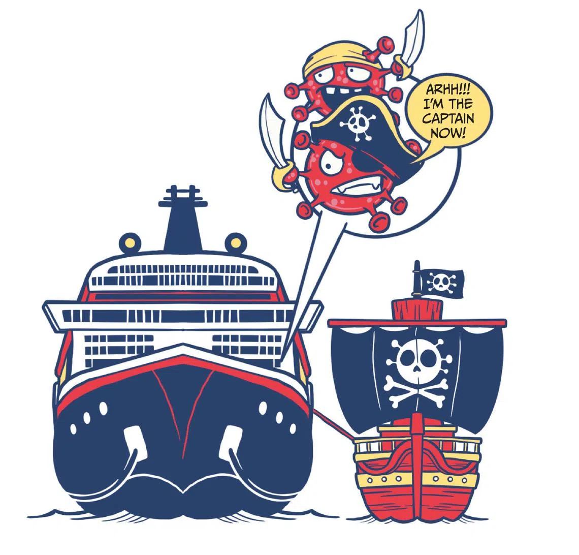 The virus hijacks and damages the body’s intestinal cells, like how pirates attack the cruise ship’s passengers and deplete the ship’s resources until a new target is identified, explained Prof Chen.