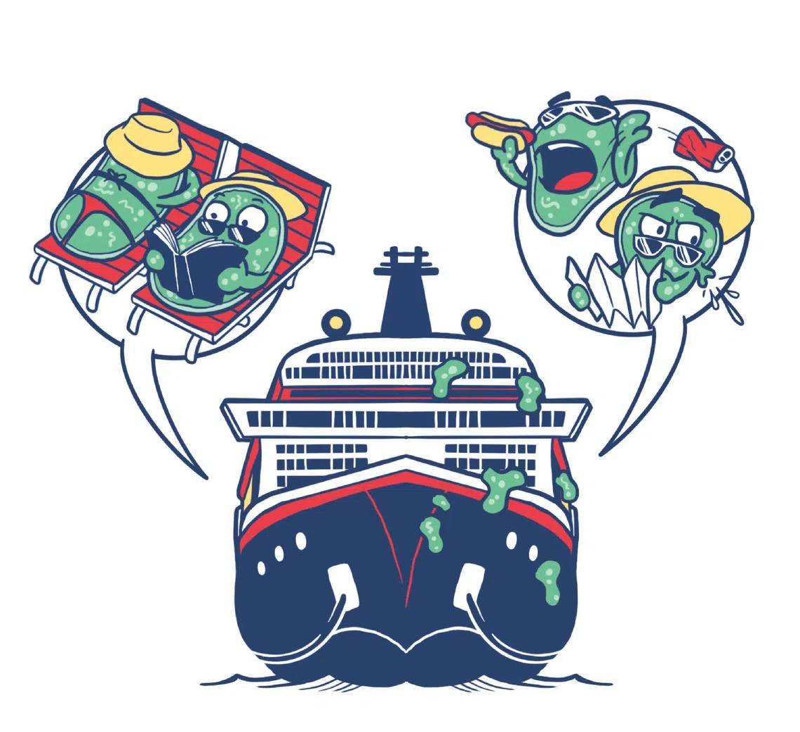 Good passengers cause no harm, while bad passengers wreak havoc by littering or vandalising the cruise ship, like how harmful bacteria create toxins that sicken the body.