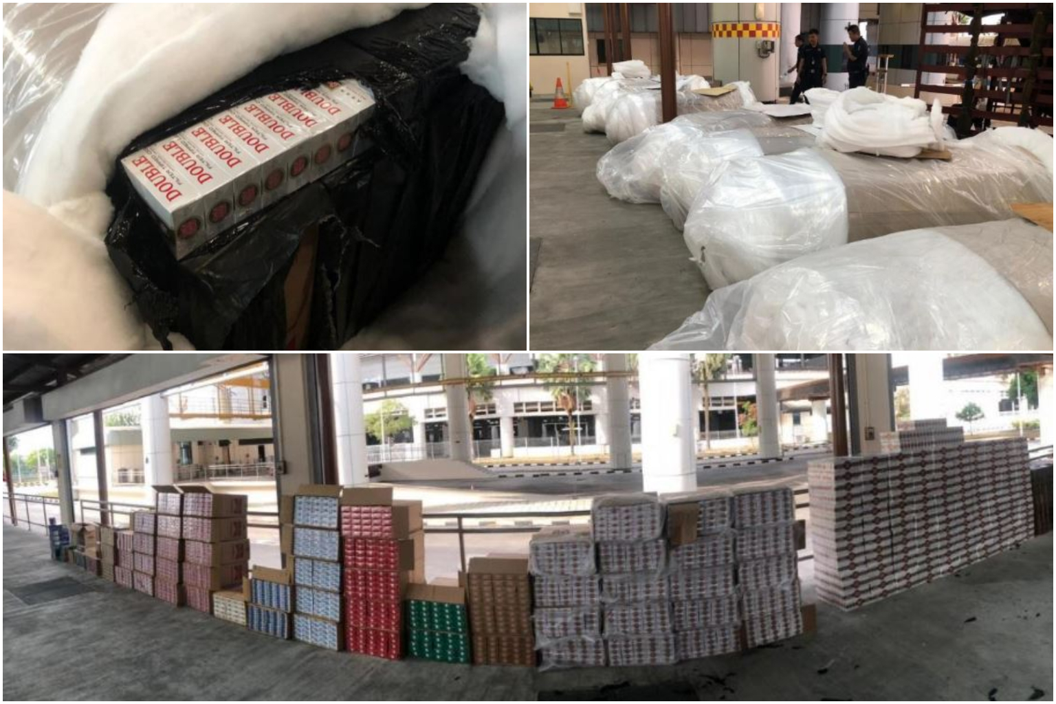 At around 5.45am on Thursday, the Immigration and Checkpoints Authority (ICA) and Singapore Customs officers stopped a Singapore-bound Malaysia-registered lorry for checks at Tuas Checkpoint. During the checks, ICA officers discovered a total of 5,599 cartons and nine packets of assorted duty-unpaid cigarettes hidden in boxes and concealed inside the fibre sponge mattresses that the lorry was carrying.