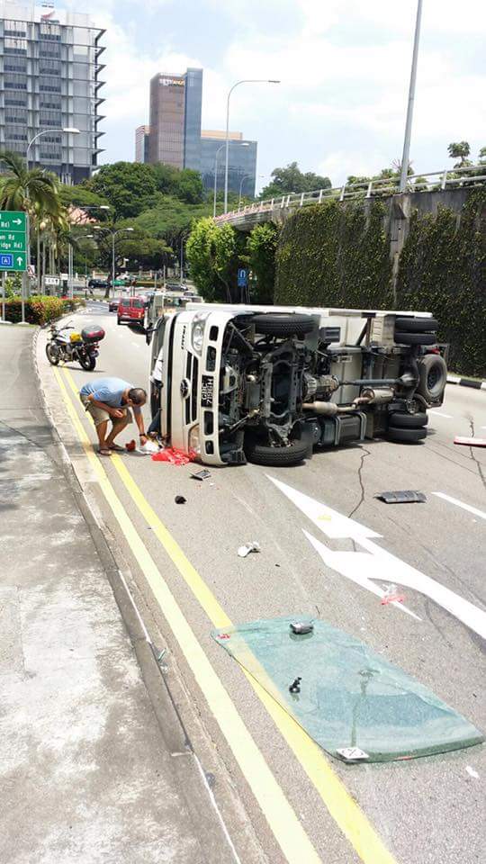 SINGAPORE - A lorry driver was injured when his vehicle overturned near the Outram exit of the Central Expressway (CTE) on Tuesday (April 19).
