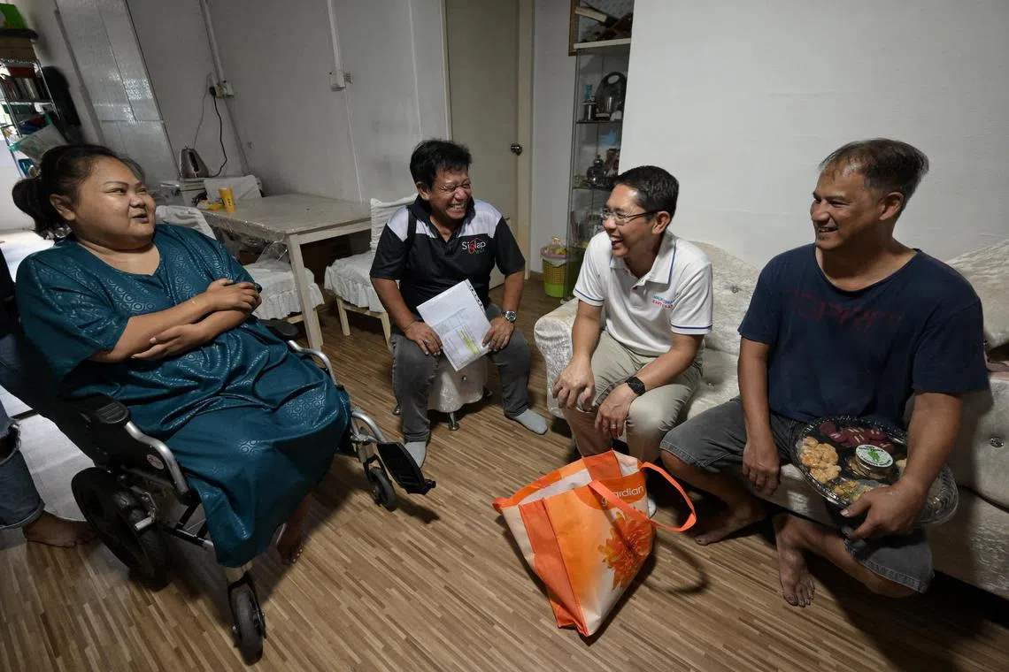 Dr Maliki Osman (second from right) paying a house visit to Madam Sateriya bte Abdul (left) and her husband Abdul Wahid (right) on April 6.