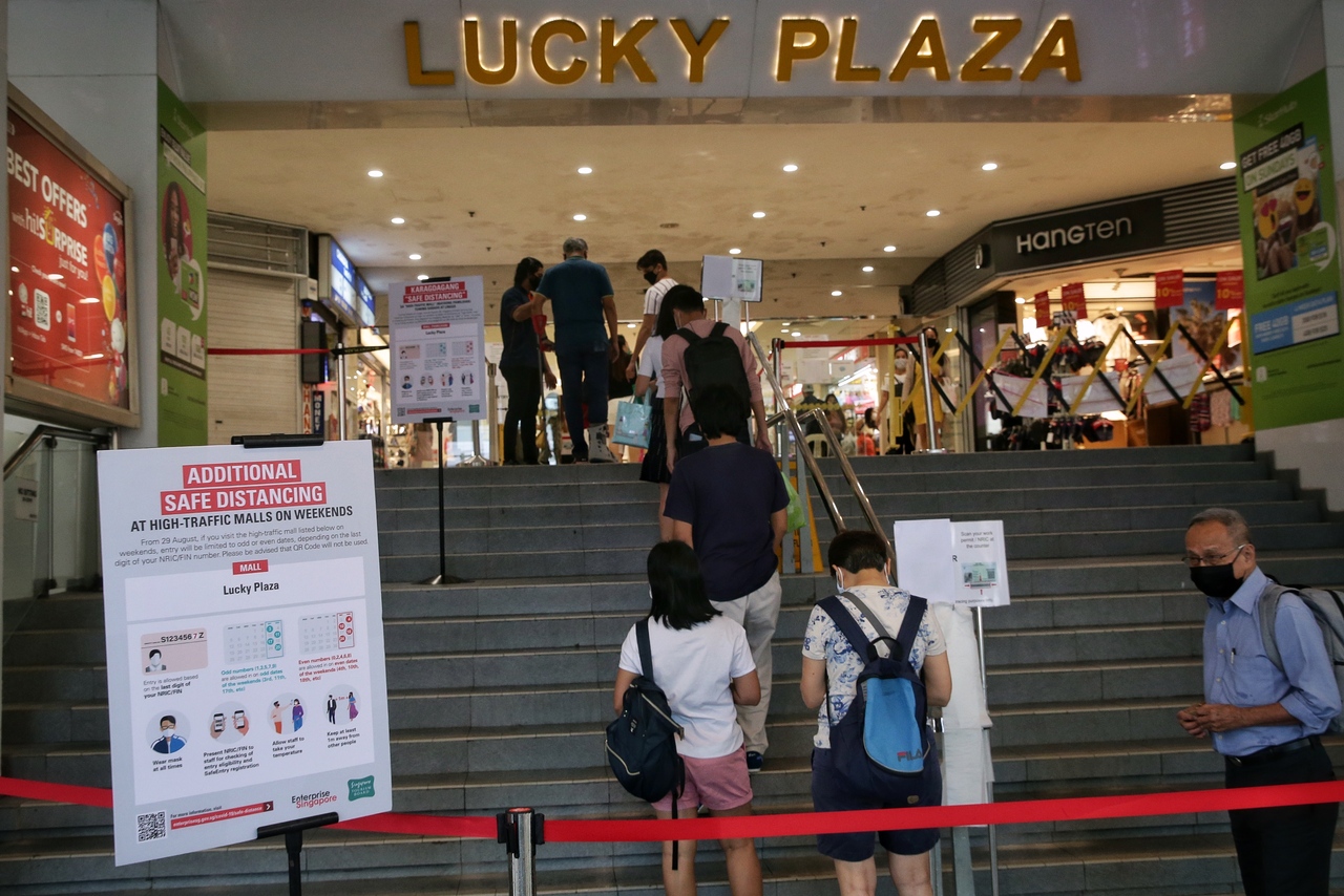 Last month, the Singapore Tourism Board (STB) and Enterprise Singapore worked with the management of two malls - Lucky Plaza and Peninsula Plaza - to implement odd and even date entry restrictions on weekends from Aug 29.
