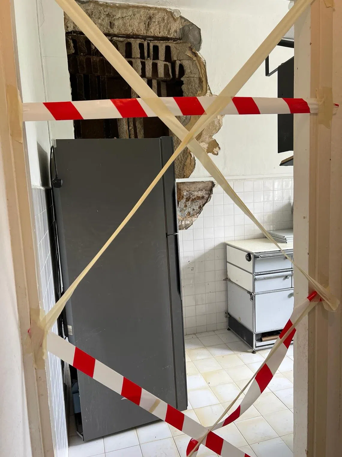 Mr Lee, who was in the living room at the time, rushed to his kitchen to find a gaping hole in one of its walls and the floor littered with large chunks of concrete and debris.