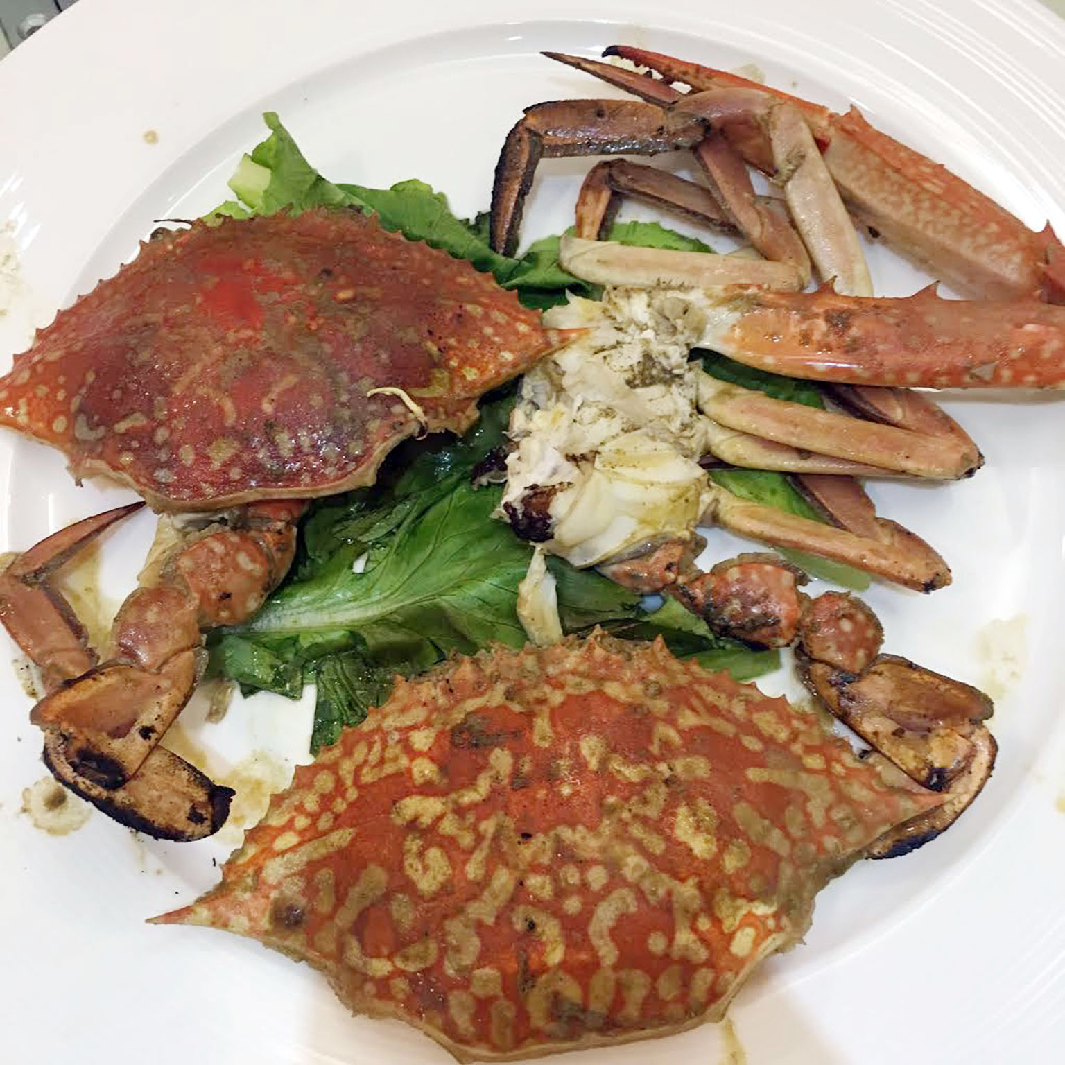 There are still pieces of crab on the plate and she proceeds to dig in. "Don't waste," she says. She ignores the plastic gloves that have been provided and uses her bare hands to break off the shell.