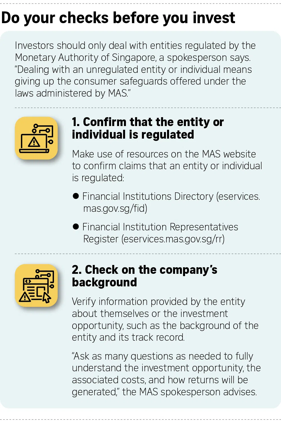 Here are some common red flags of investment scams that consumers should look out for, says a spokesperson from the Monetary Authority of Singapore.