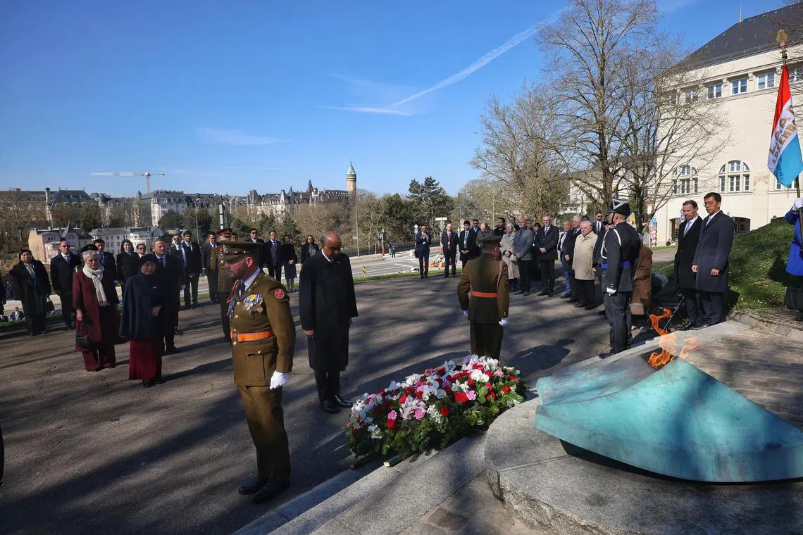 He held a ceremonial sword to an eternal flame at the front of the memorial, which overlooks the Petrusse River that flows through Luxembourg, and greeted members of the Second World War Remembrance Committee and representatives of patriotic movements and associations.