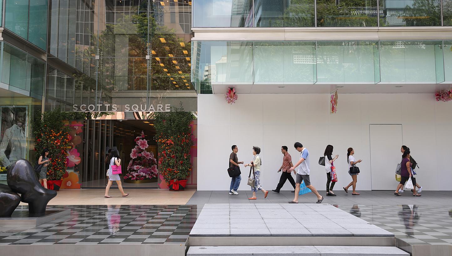 Empty shopfronts dot the gleaming levels of Scotts Square. Despite its prime location in the Orchard Road retail belt and a line-up of high-end brands, the luxury boutique mall has seen an exodus of retailers as crowds stay away.