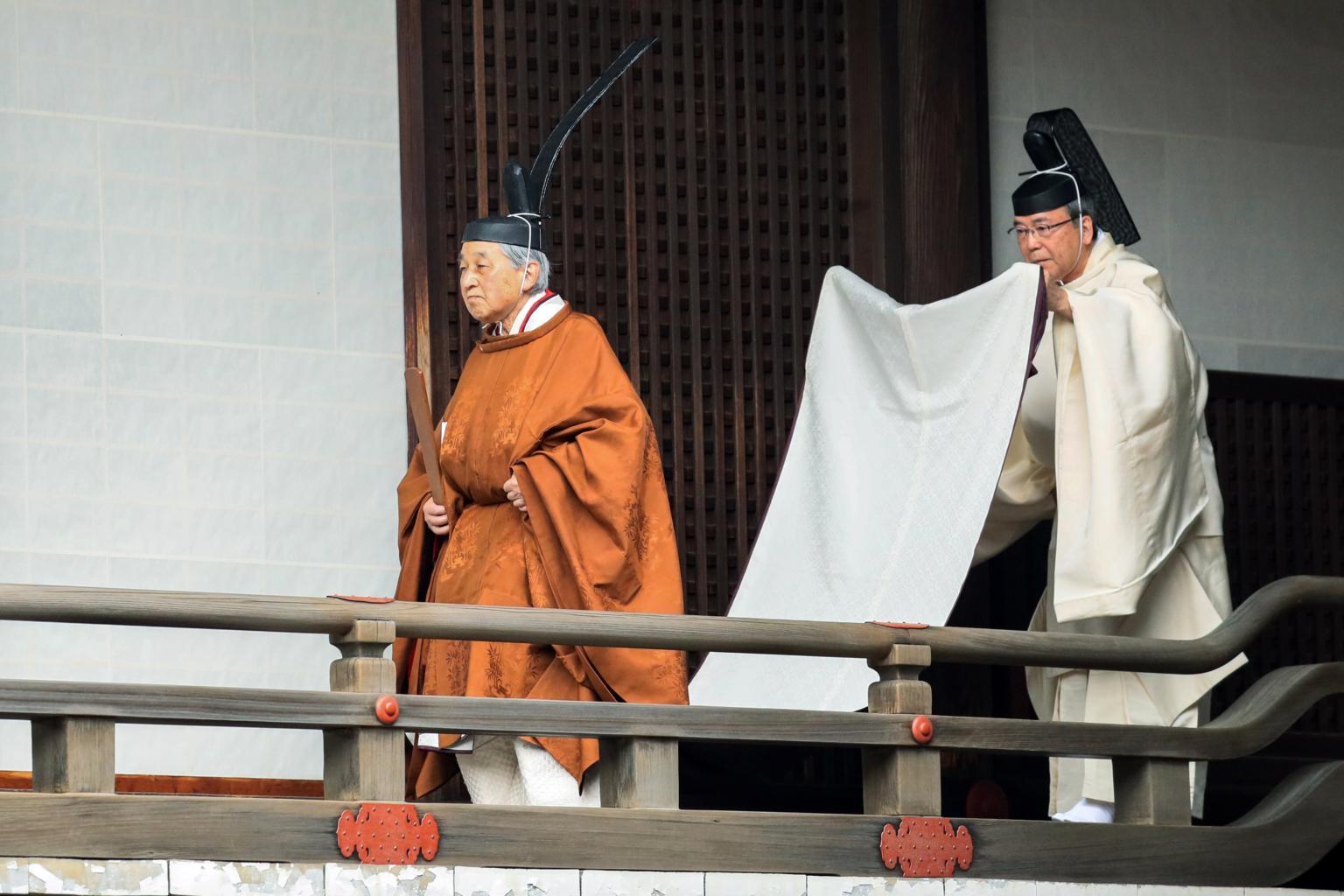 Japanese Emperor Akihito on his way to attend the Taiirei-Tojitsu-Kashikodokoro-Omae-no-gi, a rite of reporting at the Imperial Sanctuary on the day of the abdication ceremony, at the Imperial Palace in Tokyo on April 30, 2019.