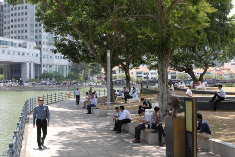 A photo taken on Oct 15 shows office workers near the Singapore River during lunch hour.