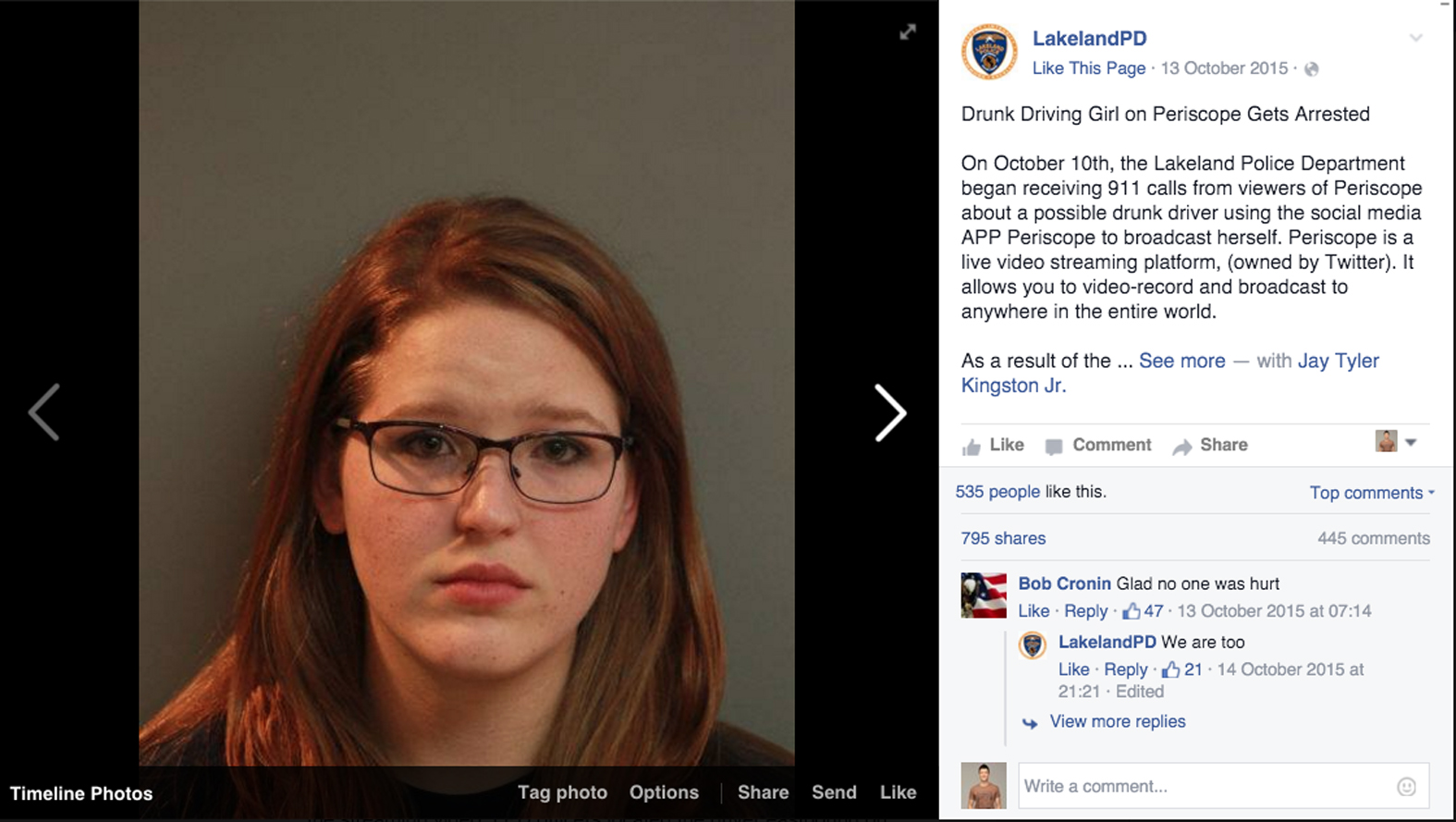 Dozens of people watched her stream. Some users sent her messages to stop, while others called the police. Lakeland police viewed the footage and correctly guessed where Beall was. Her car, which had one flat tyre, had hit a curb by the time they got to her.