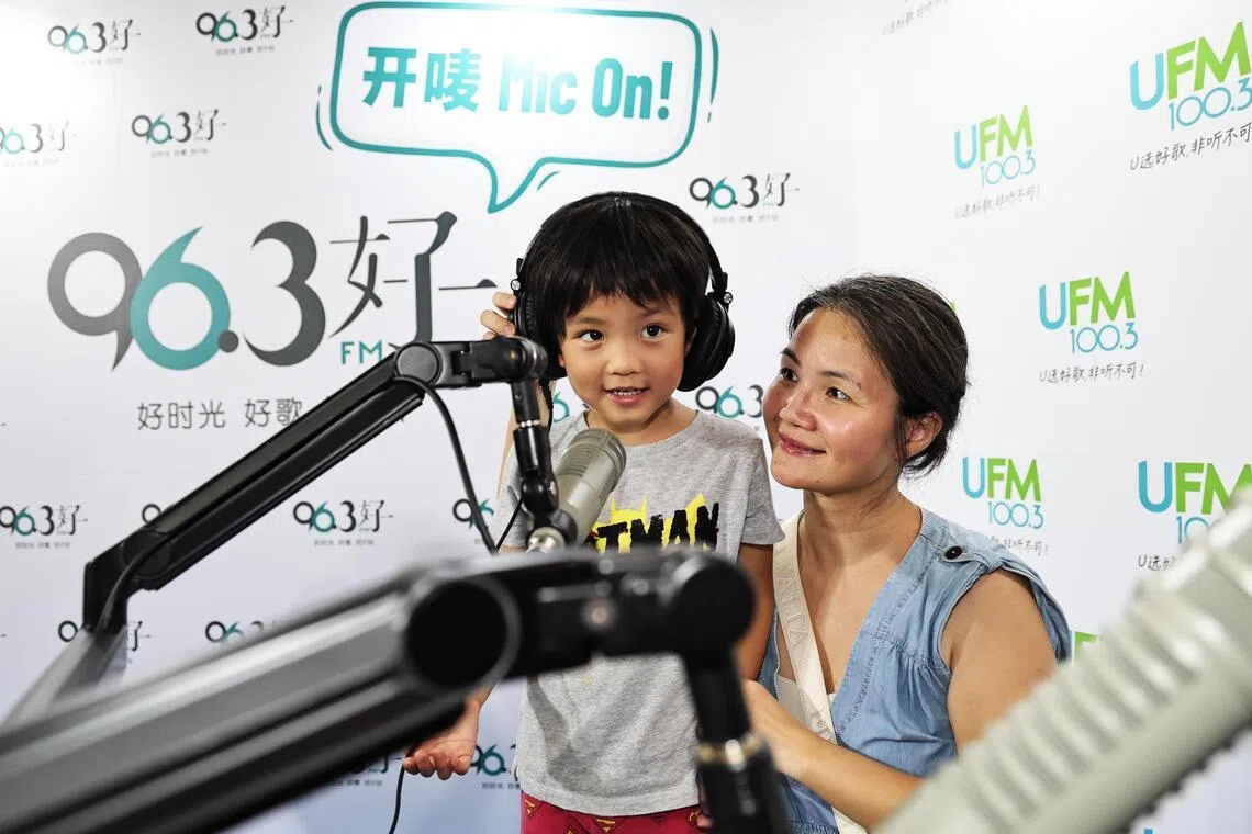 Homemaker Katy Mak, 42, with her son Lim Jia Cheng, five, at the radio station booth.