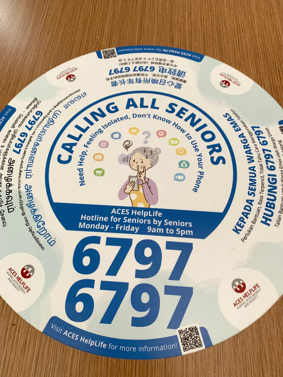 An advertisement for Aces Care HelpLife on the table of a food centre in Ang Mo Kio Central.