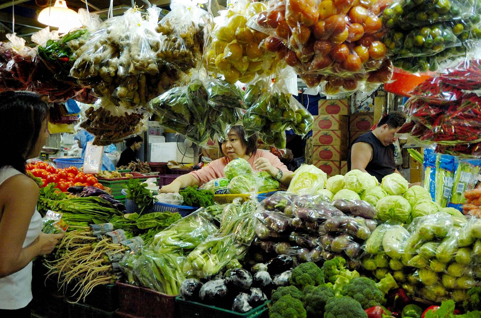 A shopper bargains with a vegetable seller at a wet market in Singapore.