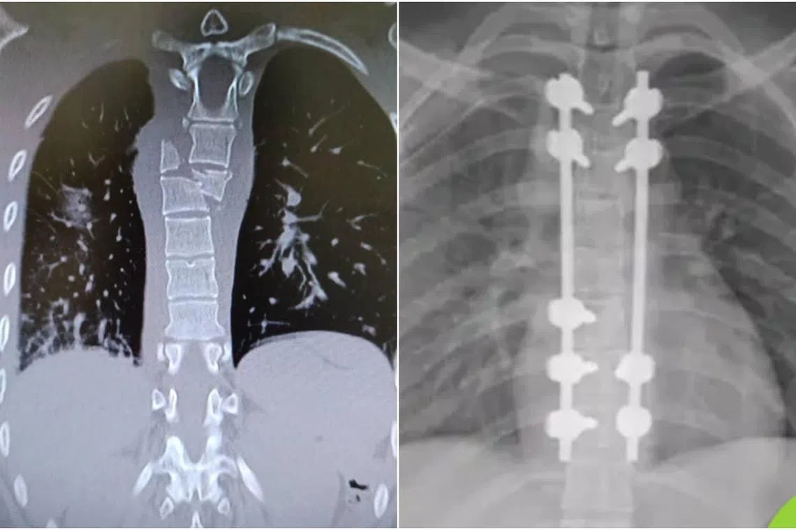 X-rays showing Ms Hong Mun Ying’s fractured spine (left) and her spine after surgery in Thailand (right).
