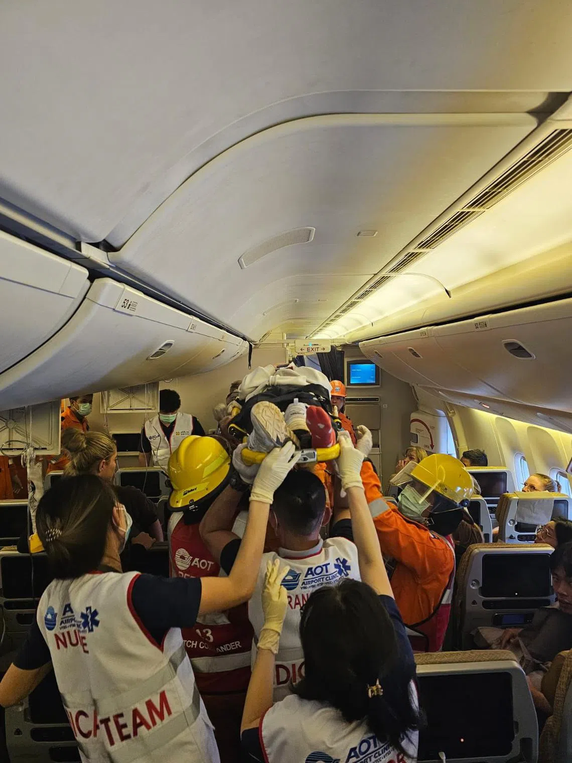 Ms Hong Mun Ying being stretchered off the SQ321 aircraft upon arriving in Bangkok.