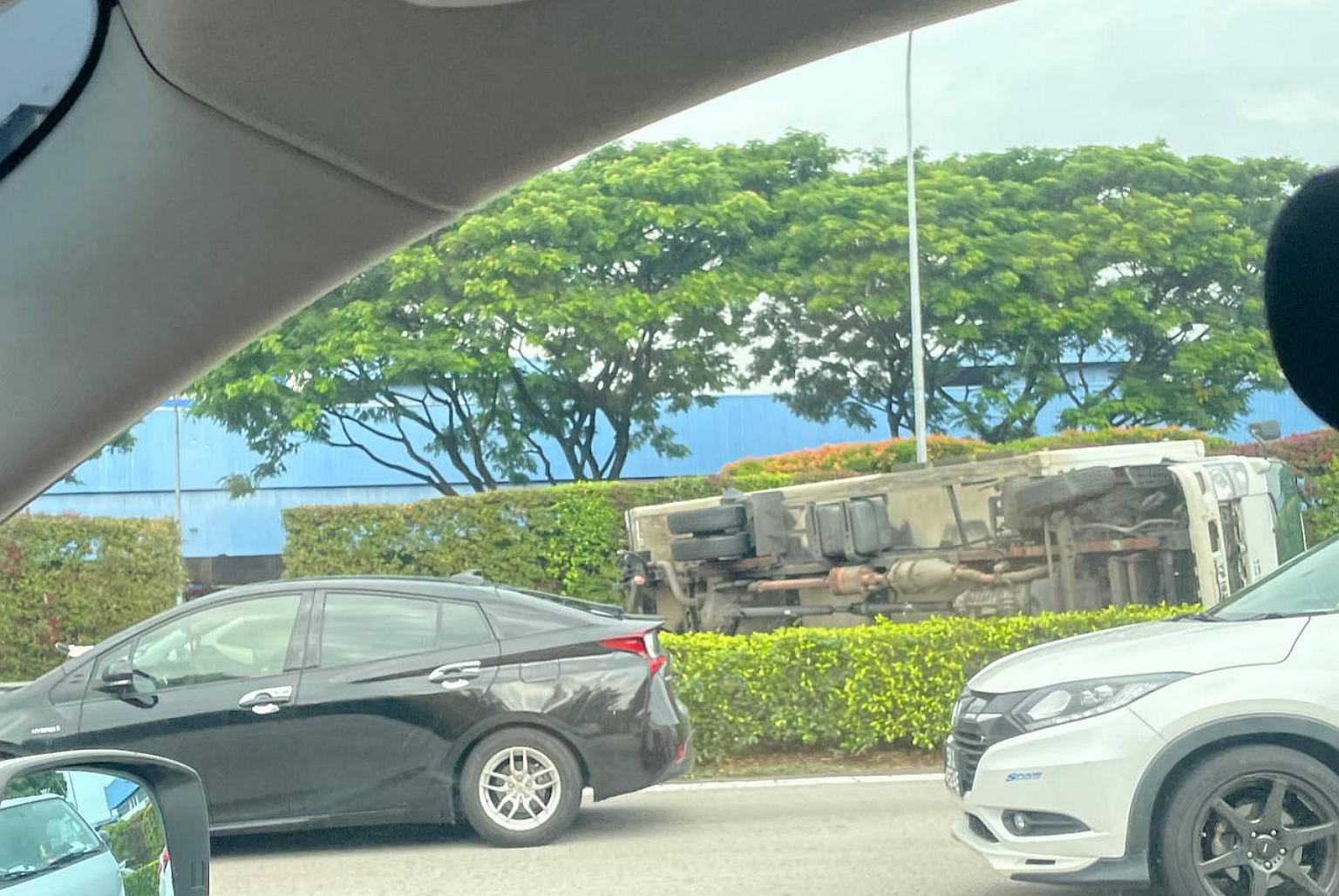 In two Facebook videos posted on Saturday, a lorry flipped on its side can be seen at the side of the road.