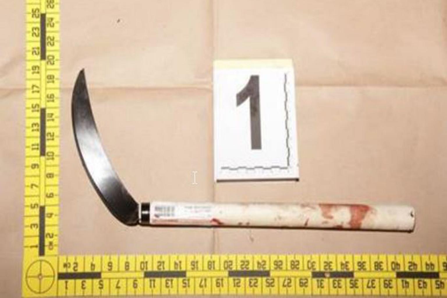 A bloodstained sickle was found by the police near the scene of the crime.
