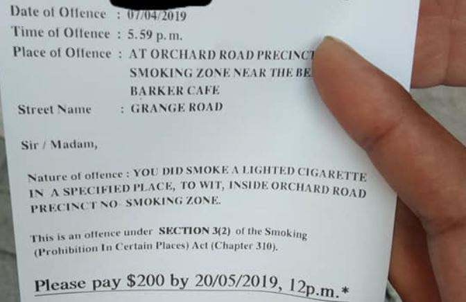SINGAPORE - A man has claimed that he was fined $200 on Sunday (April 7) by the National Environment Agency (NEA) for smoking along Orchard Road, despite having only one foot outside a designated smoking area.