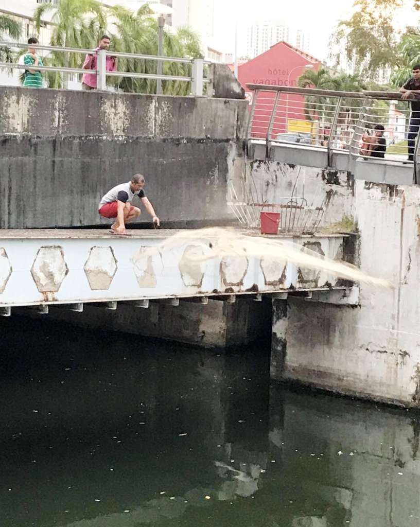 A man was called out for his dangerous act of climbing over a railing to illegally cast a fishing net in Rochor Canal on Saturday.