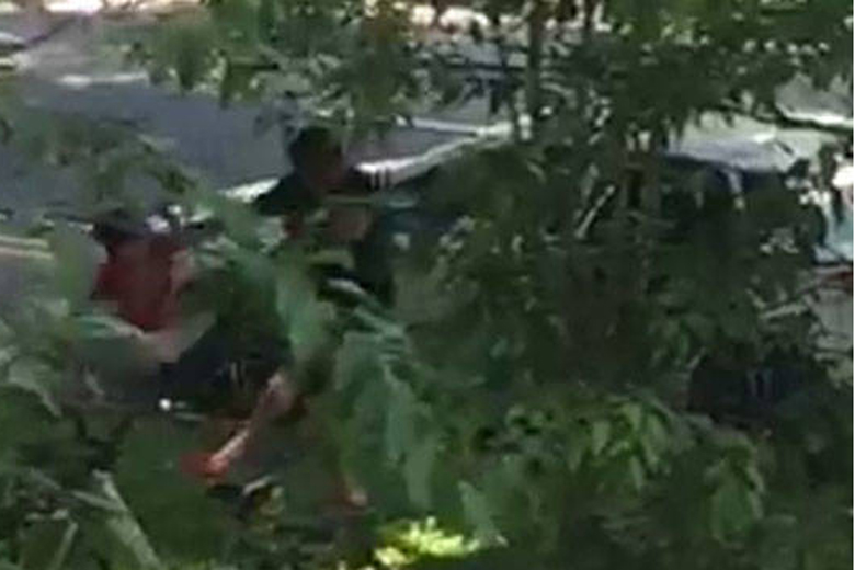 The child then approached the man, who appeared to be berating the child. The man then suddenly shoves the boy forcefully onto the grass patch.