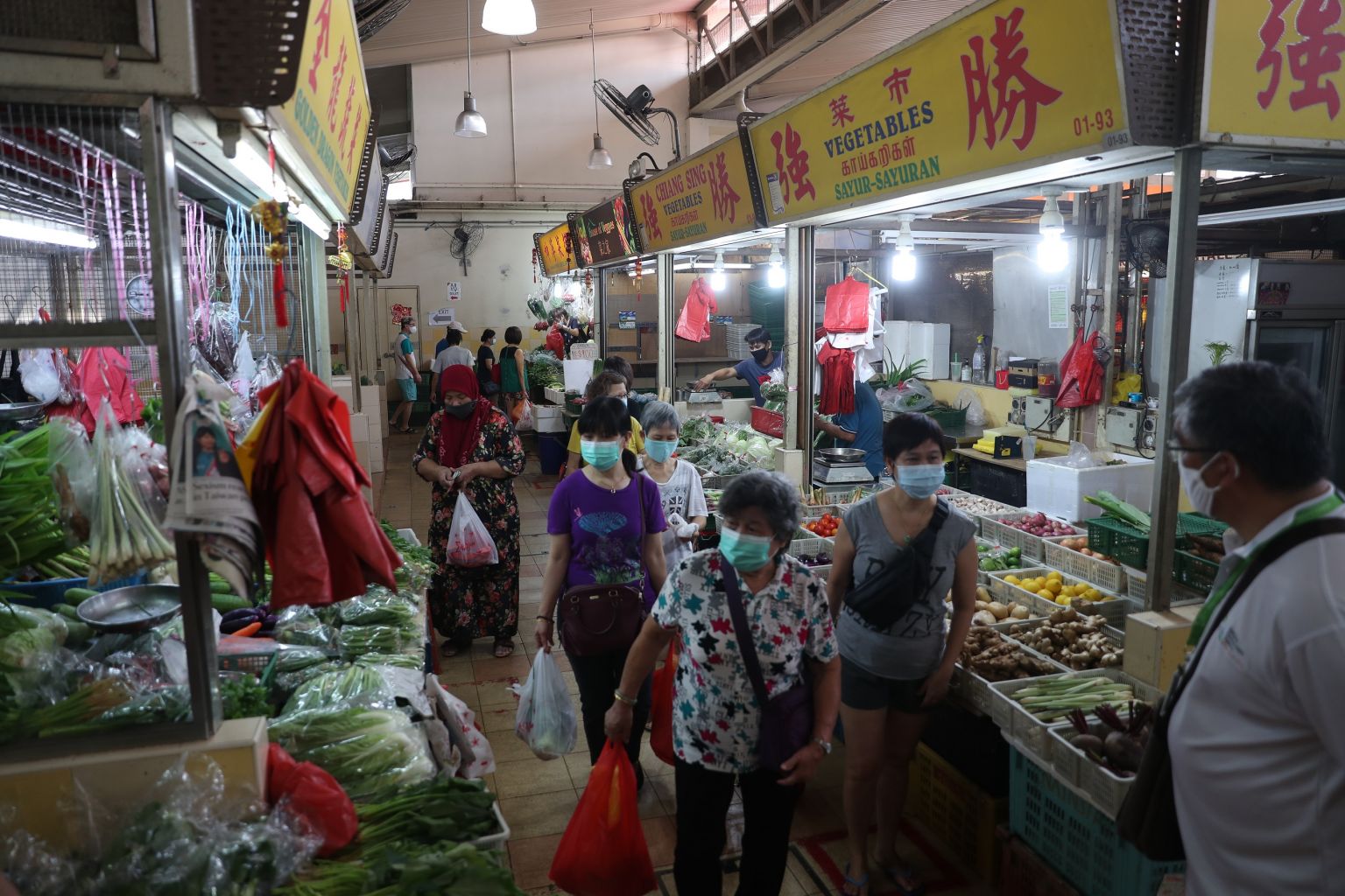 An NEA enforcement officer (right) patrols Yuhua Market and Hawker Centre for people not wearing masks.